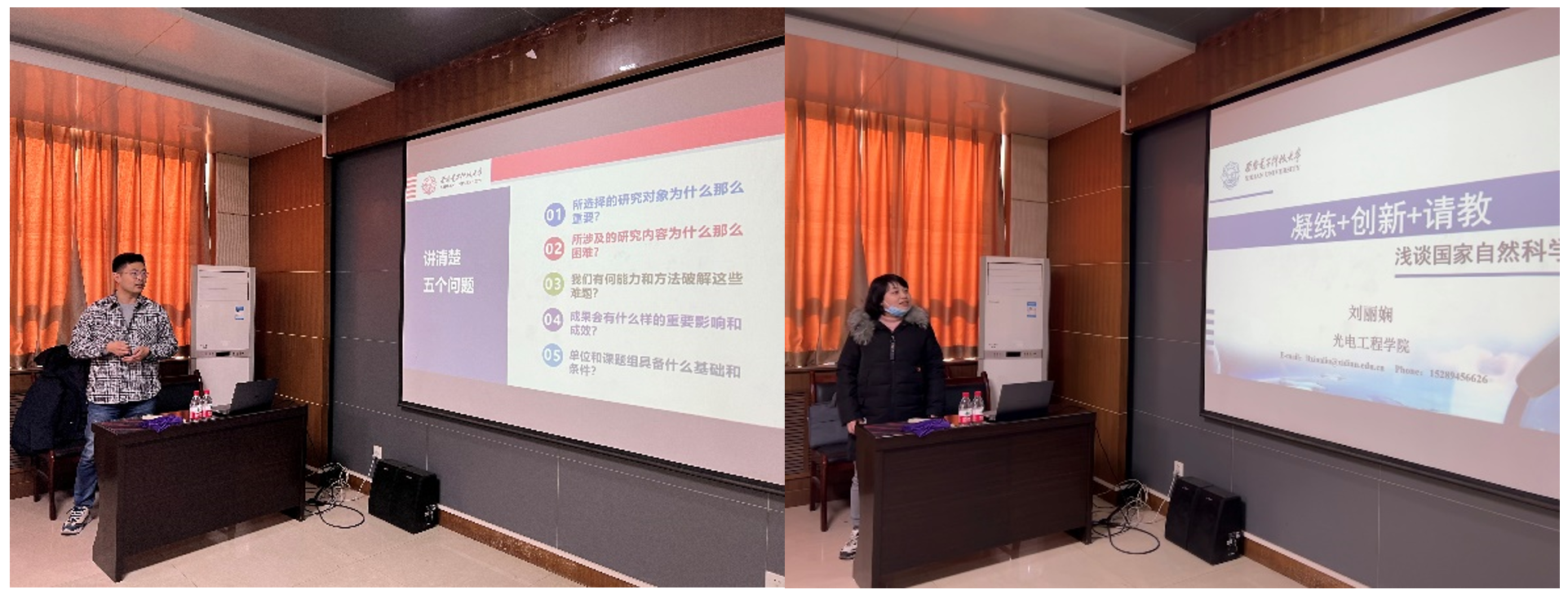 随后,李轩、刘丽娴分别分享了青年科学基金项目、面上项目的获批经验和申报体会,就选题方向、题目撰写、成文要点和修改润色各方面进行详细解读,同时建议要多向有经验的老师请教,凝练好科学问题,夯实研究基础,提升国家自然科学基金申报书质量。参与基金申报的全体老师对当前基金撰写的进度和面临的难点进行汇报交流,院领导对集中出现的问题进行了分析答疑。