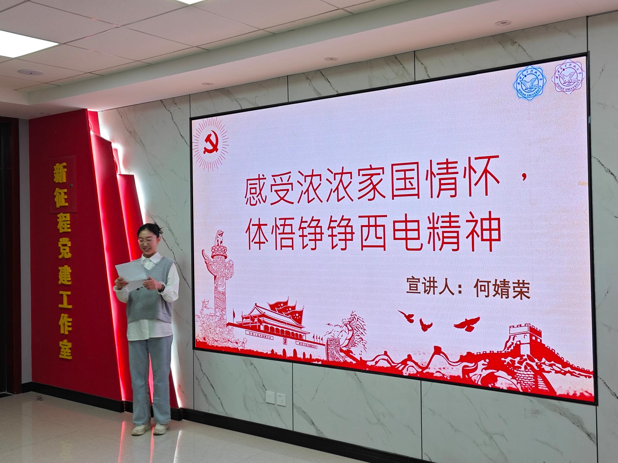 微电子公司研究生何婧荣进行了主题为“感受浓浓家国情怀,体悟铮铮西电精神”的宣讲。她结合自身经历,从“全心全意为人民服务”的情怀传承、“永不消逝的电波”的文化认同、“厚德、求真、砺学、笃行”的心灵归属三个角度展开,呼吁西电青年赓续红色基因,心怀“强国有我”的信念,将个人前途命运与祖国、民族的未来结合在一起,为中华民族伟大复兴贡献自己的力量。