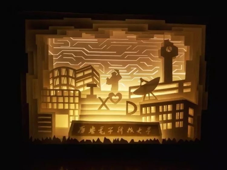 物理与2017届毕业生以“光影西电”纸雕灯箱的形式,描绘了他们心中的西电,并将其赠予母校,以此表达自己的西电情。