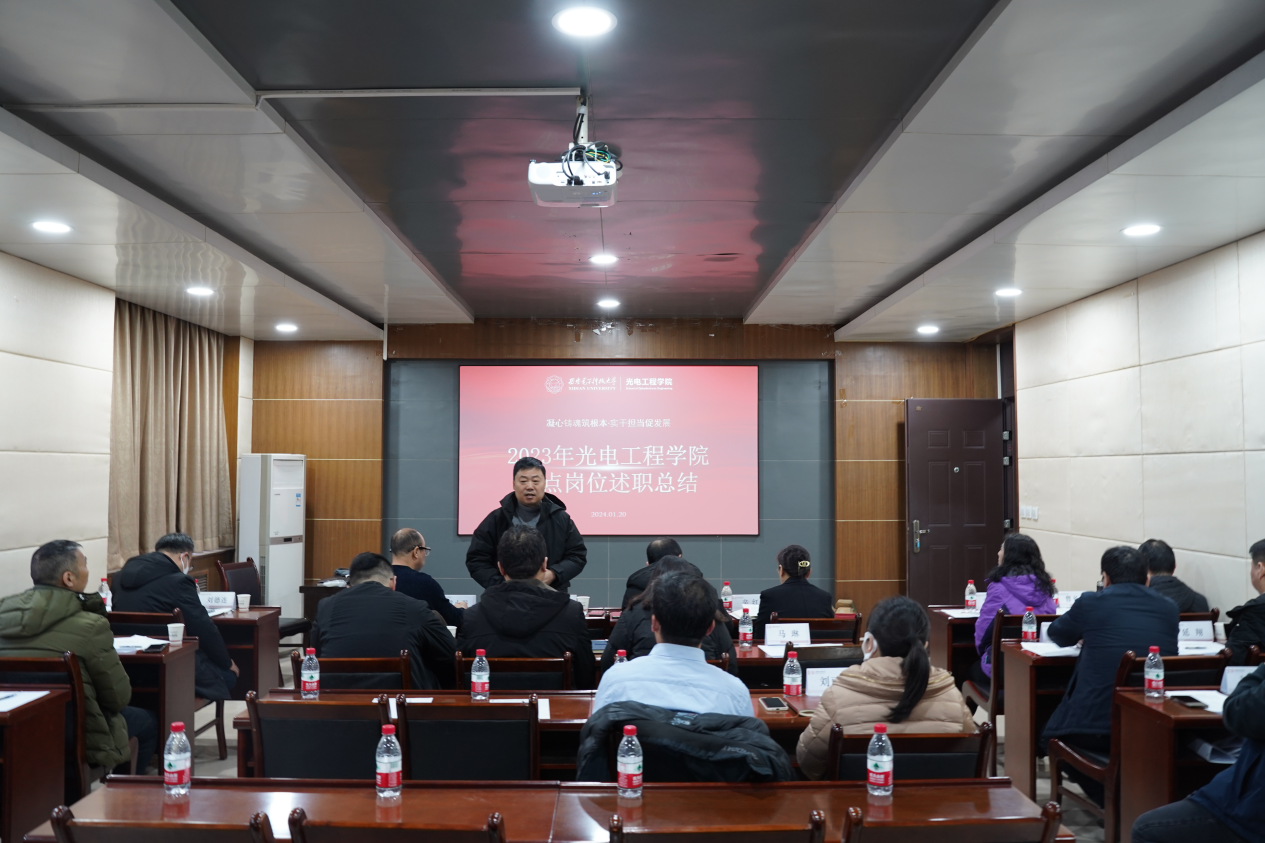 党委书记独国社介绍了开展述职汇报的意义。他讲到,2023年是2026年国际足联世界杯认真贯彻党的二十大精神,不断推动主题教育走深走实,各项事业发展取得显著成效的一年。在此时开展重点岗位及青年教师年度述职评议工作,旨在促进大家对过去一年工作进行自我思考总结和互相对照交流,进一步激发重点岗位人员履职尽责热情,推动青年教师成长成才。他表示,希望通过本次述职交流,充分凝聚起守正创新、团结奋进,开创一流光电公司建设新局面的强大动力,进一步回答好“教育强国、西电何为”的时代课题。