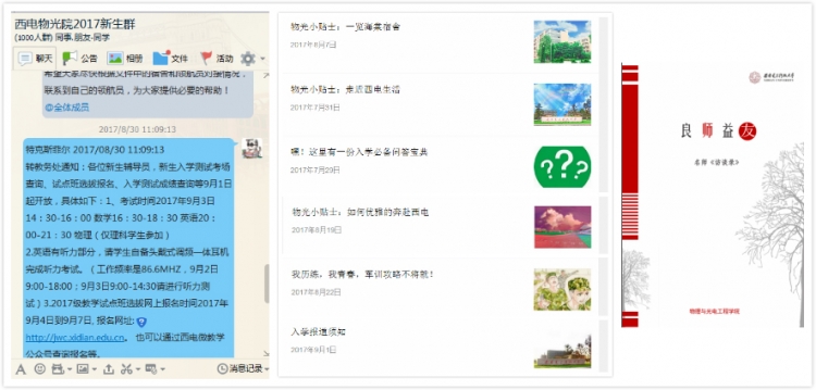 为做好公司新生接待工作,确保新生顺利报到,公司提前召开迎新工作协调会,对整个迎新接待工作的各个环节进行了细致周密的部署,并利用暑期对一系列工作紧锣密鼓进行筹备。7月底开始,公司官微“西电物光院”就逐步制作推出“物光小贴士,走进西电生活”、“欢迎你,2017物光er”等新生系列特辑,帮助新生提前了解公司学习、生活环境;新生辅导员和高年级员工创建“2017物光er”QQ、微信讨论群,对有关军事训练、入学考试、卓越教改班选拔等新生最为关注的相关事宜做了及时解答;专职教师结合公司特色专业方向,以访谈寄语的形式表达对新生的欢迎和期许,公司将其整理编辑,印制成精美的《良师益友》画刊,作为“新生入学礼”赠送给每一位新生。