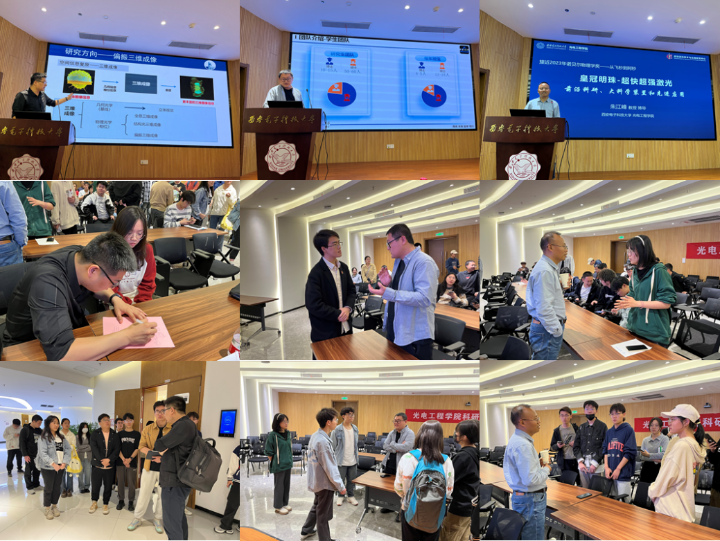 活动伊始,刘飞深入浅出地介绍了计算成像技术的最新进展和应用前景,介绍计算成像团队的招生计划。他通过生动的案例展示讲解计算成像在现代影像、水下设备、安全监控等领域的关键作用,现场师生对计算成像技术有了更加直观的认识。李金泽从红外物理的基本原理出发,介绍了红外技术在军事侦察、环境监测、大型游戏等领域的广泛应用,并结合团队的研究项目,详细讲解了红外物理与工程领域的最新研究动态和技术突破。最后,朱江峰从2023年诺贝尔物理学奖引入,围绕超快激光技术的发展现状、技术难点及未来趋势进行了详细讲解。他重点介绍了超快激光技术在材料加工、生物医学等领域的重要应用,并分享了团队在超快飞秒激光技术领域的最新研究成果。