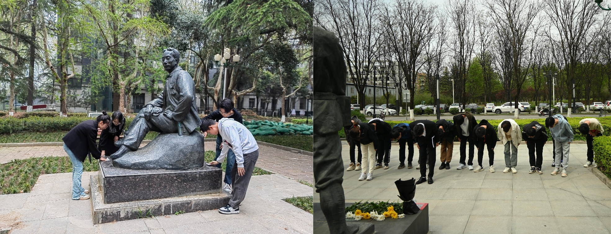 随后,同学们进行祭扫活动,对雕像周边进行打扫,细心扫除落叶、纸屑等散落的垃圾。他们手持抹布,轻轻擦拭着王诤将军和李白烈士雕像的每一个角落,为其洗去周身灰尘,每一个细节都透露出对革命先辈的无限怀念。接着,同学们献上精心准备的花束,默哀一分钟,用静默表达最崇高的敬意,用行动诉说着对英雄的缅怀与追思。