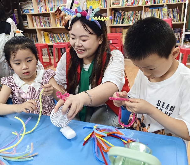 活动主要分为绘本阅读和扭扭棒手工DIY两部分。志愿者首先为小朋友们讲解绘本故事《小木匠学手艺》,接着介绍神奇的扭扭棒DIY材料,并展示了如何用它们制作出精美的发箍饰品。志愿者们耐心讲解制作步骤,手把手地教孩子们如何扭动制作材料、如何固定发箍、如何添加装饰,小朋友们被这些五彩斑斓、形状各异的饰品深深吸引,纷纷跃跃欲试。活动现场气氛热烈,小朋友们认真聆听,积极动手,沉浸在创作的乐趣中,不时传来阵阵欢声笑语,不一会儿,一个个充满创意的发箍就在孩子们手中诞生了。志愿者们不仅传授了制作技巧,还鼓励小朋友们发挥想象力,大胆创新,尝试使用不同的颜色搭配、形状设计,让每一个“作品”都独一无二。
