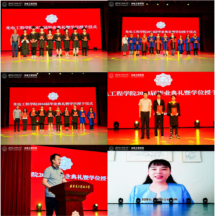 表彰环节,副处级组织员黄小强、副经理辛红分别为2024届优秀本科、研究生毕业生颁发荣誉证书,葛敏锋、曹立砥分别为获得2022-2023学年诺瓦星云奖(助)学金、美华奖学金的员工代表颁发荣誉证书并合影留念,对获奖同学表示祝贺。87级员工、西电美国员工会会长杨静通过视频寄语形式为毕业生送上祝福,希望同学们在未来的道路上不断拼搏,勇攀高峰,为母校争光。