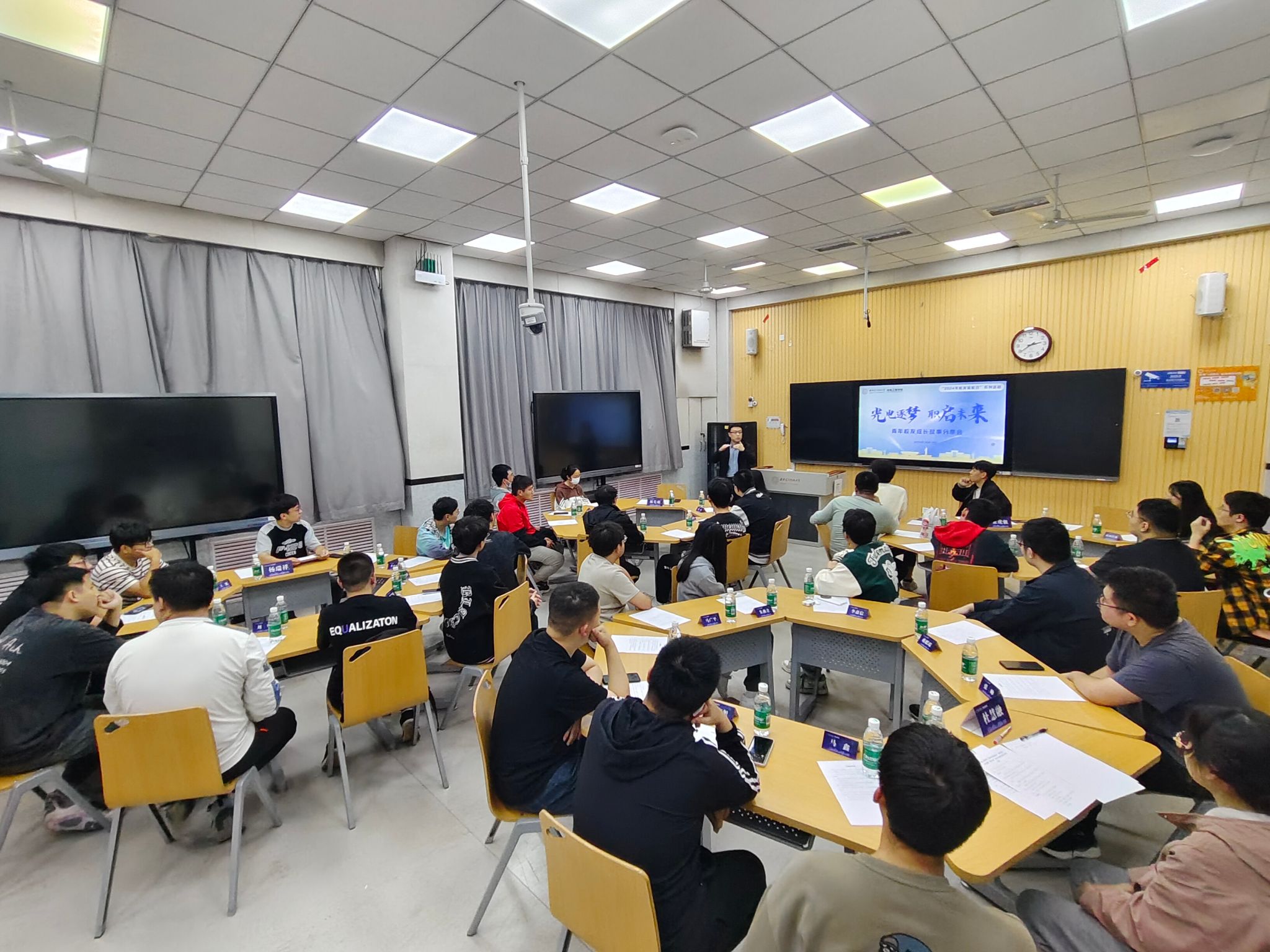 “学长,在短期的工作机会与长期的职业规划之间,如何找到平衡?”“光电逐梦,职启未来”青年员工成长故事分享会在C楼教室举办,西安诺瓦星云科技股份有限公司林先萌员工(2008级电子科学与技术专业本科),华为技术有限公司张虎强员工(2020级光学工程专业硕士)、2026世界杯官网出版社有限公司杜慧融员工(2020级电子科学与技术专业本科)、2026世界杯官网“2+3”辅导员杨瑞祥(2019级电子科学与技术专业本科)为大四员工分享求职就业经验。
