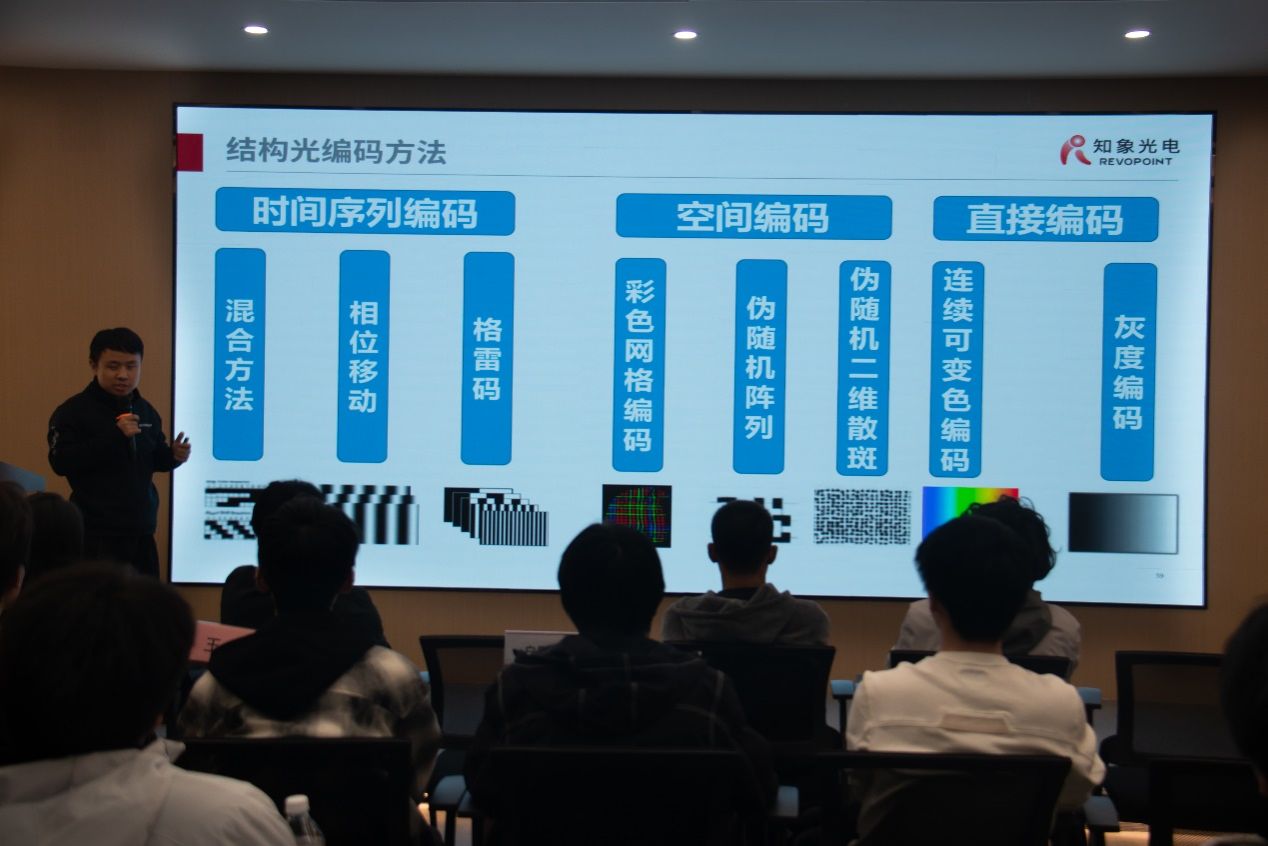 随后,公司技术专家白民宇博士进行了简短而精彩的报告。他结合自身科研经历,深入浅出地讲解了三维成像技术的原理与应用,鼓励同学们在学习中勇于探索、敢于创新。在白博士的带领下,本科生参观了公司的核心实验设备,高精尖设备的展示让同学们深刻体会到科技创新的力量。在实验室,看到精密复杂的仪器设备有序运行,科研人员专注投入,这里是知象光电3D 成像技术从理论迈向实践的孵化地。
