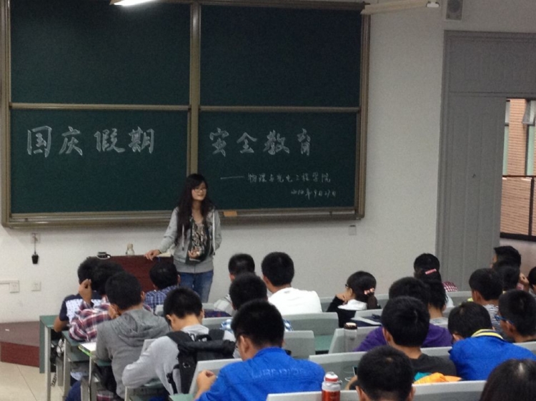 (通讯员 吴俊镐)9月27日下午2时30分,物理与2014级辅导员杨康敏老师在A楼106室对电子信息科学与技术、应用物理和电波专业的同学进行了“国庆假期安全教育”宣讲。