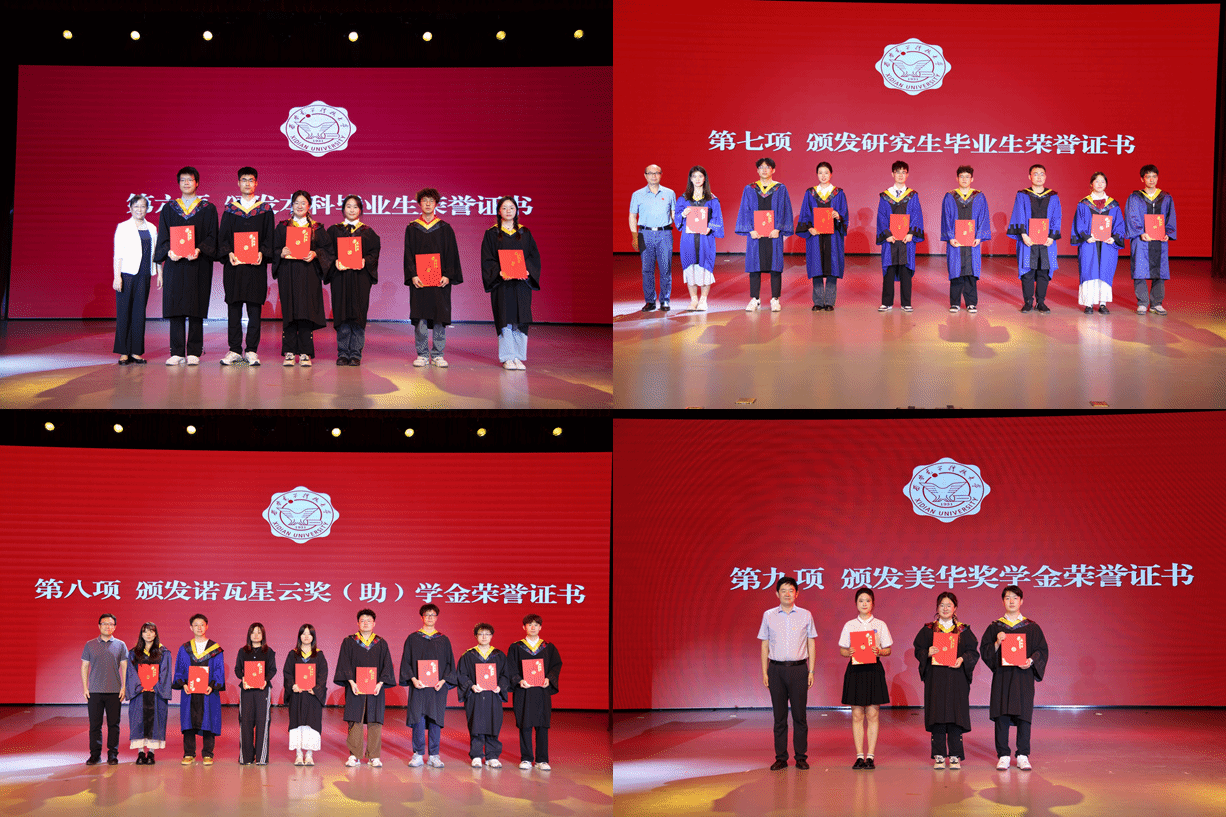 表彰环节,副经理辛红、副处级组织员黄小强分别为2025届优秀本科、研究生毕业生颁发荣誉证书,西安诺瓦星云中研院实验室主任、2008级员工林先萌、公司员工事务与对外合作处副处长兼对外战略合作办公室主任曹立砥分别为获得2023-2024学年诺瓦星云奖(助)学金、美华奖学金及其提名奖的员工代表颁发荣誉证书并合影留念,对获奖同学表示祝贺。