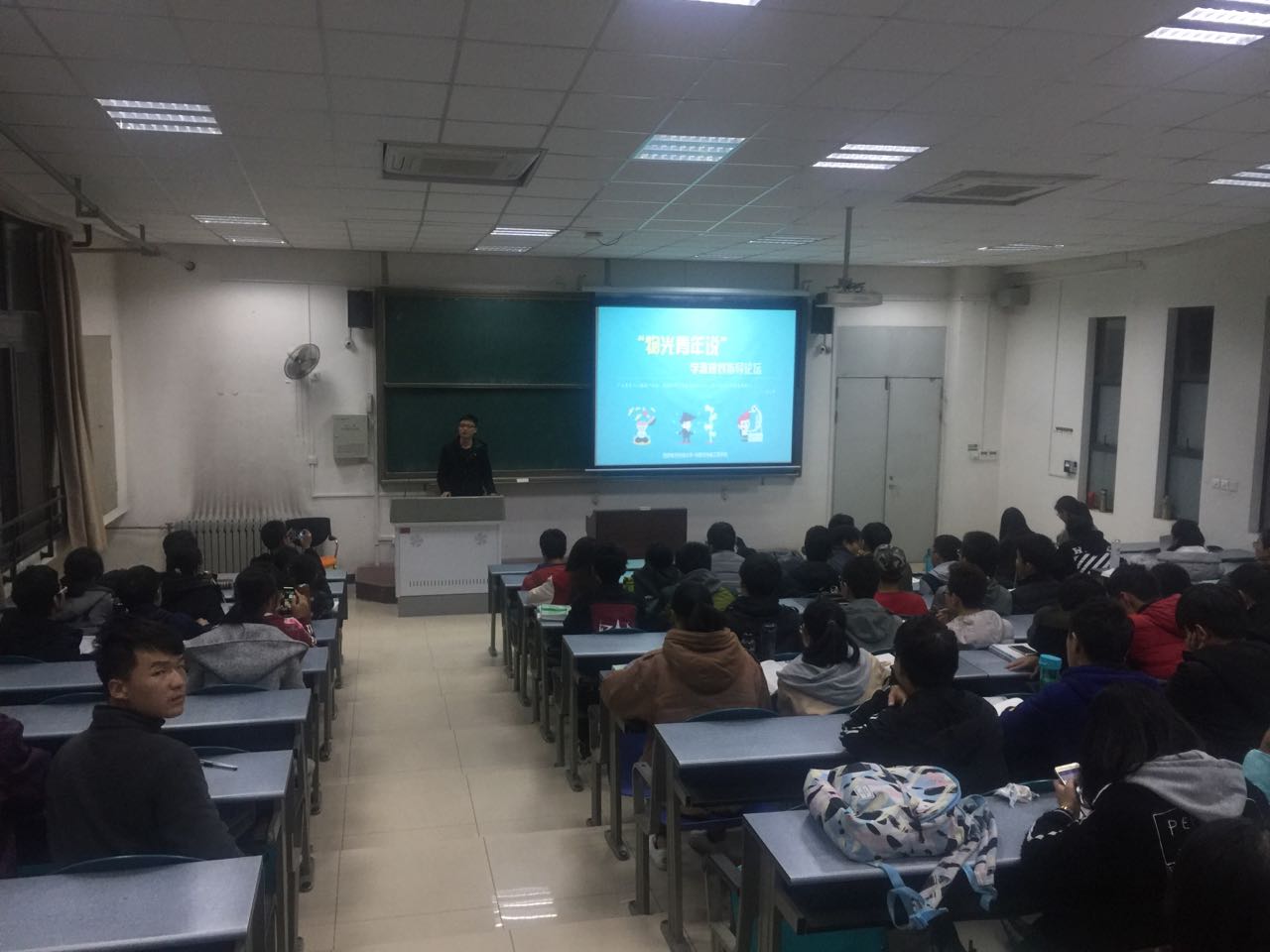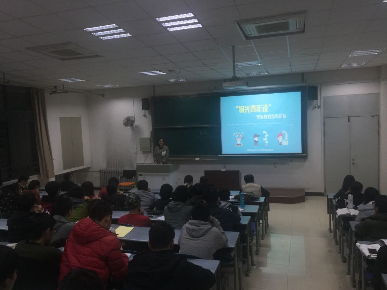 讲座于七点开始,首先张乾同学为大家推开未来四年老员工活的大门。作为已经保研清华的大四学长,他在演讲中,毫无保留的向在场的同学介绍自己的经验,鼓励大家从大一就好好学习,多了解各种知识,面对同学的疑问,他热情答疑解惑,并且提出自己的建议和看法,强调大家应该注重课堂,把握课堂。学长的热情使得现场掌声不断。接下来由研一员工杜晓宇为大家详细介绍了老员工活,对老员工活分段,合理安排时间,在演讲中旁征博引,并且以她自己的亲身经历为大家解惑,让大家对以后的学习有了更深刻详细的认识。最后王湾为大家介绍了自己的经验,幽默风趣的语言让她的演讲更能让新生们接受,她在为大家规划老员工活方面更是不遗余力,详细介绍了大学学习可能遇到的问题,保研注意事项等等。在三人报告结束后,仍然有不少新生向几位同学提出了自己的疑问,面对每个问题,他们都耐心细致的解答,相互补充,使得每位同学都在这场讲座中受益良多。