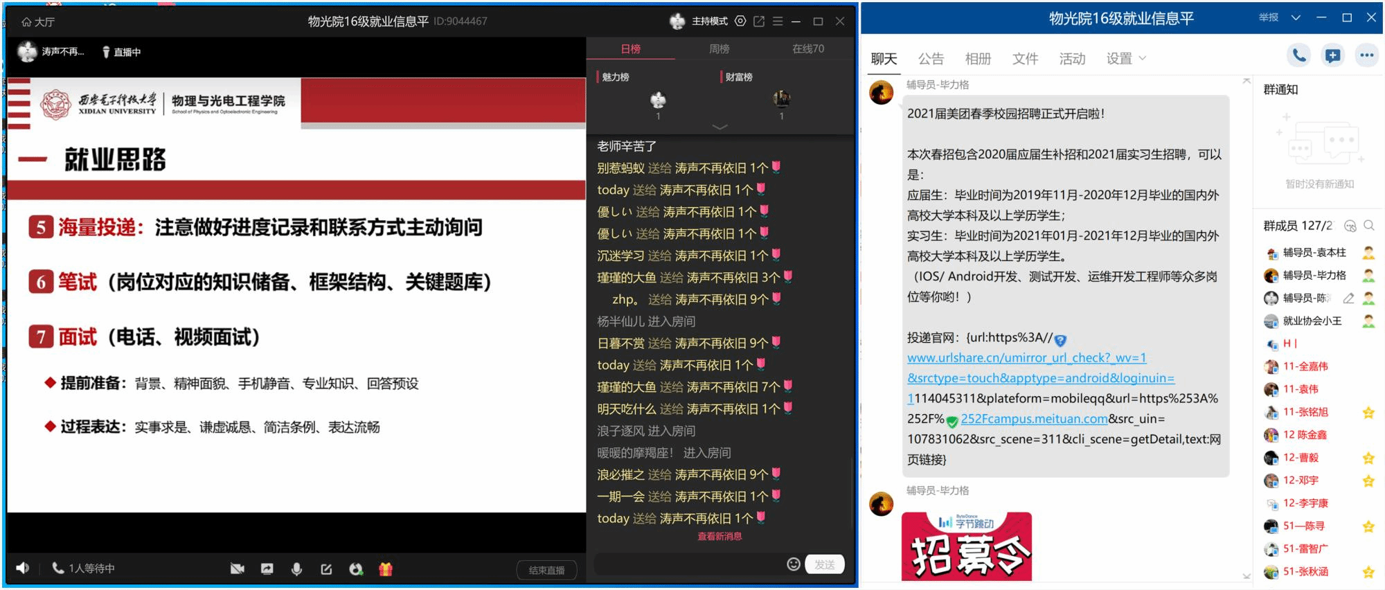 辅导员开设线上就业“微”指导活动,重点面向就业“零经验”的考研失利员工等群体,每周发布两期就业指导“微板报”,内容涉及就业形势分析、求职计划安排等;由实习就业经历丰富的同学担任就业线上联络员对接班级,分享招聘信息和方法技巧;员工、导师结合当前行业发展需求,为毕业生提供线上个体咨询;家校共育,向家长介绍校院就业服务和招聘信息,发挥其在疫情期间对毕业生的督促作用,促进毕业生积极求职。