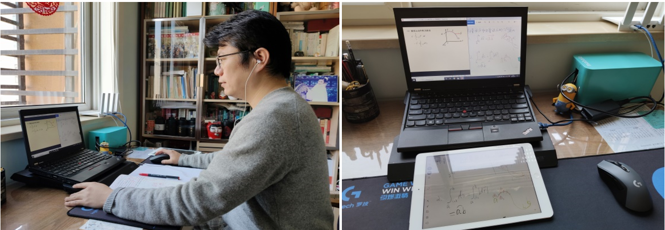 课程组老师为了达到满意的教学效果,结合线上教学的特点,八仙过海,各自寻找适合自己的教学方式和“武器”。王飞老师为了将复杂的推导过程演示清楚,专门购置了高拍仪。唐映德老师为了呈现清晰洪亮的视频音频专门购置了摄像头、耳机等。汪加洁老师还多管齐下,课程学习微信群、QQ群、数位板、双电脑屏幕,并对线上教学总结出一套自己的经验。