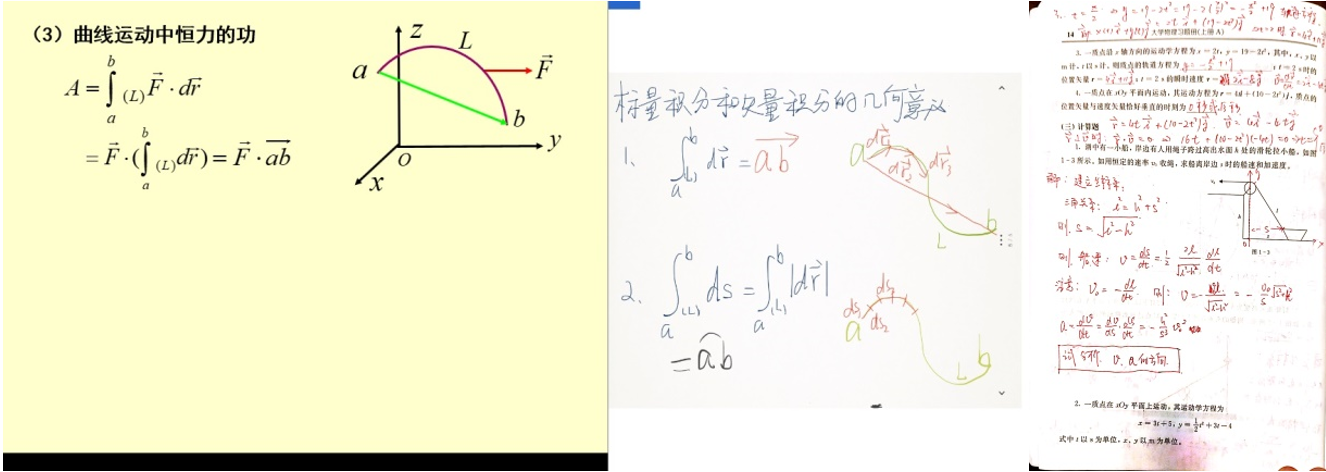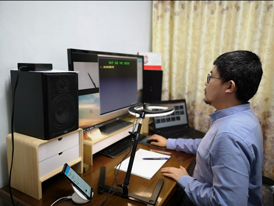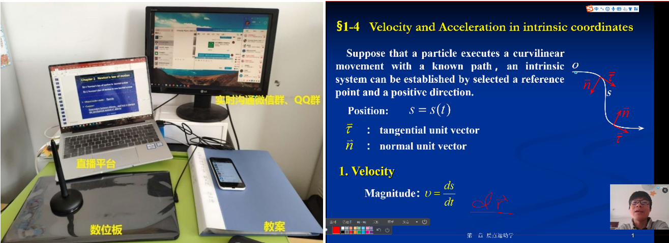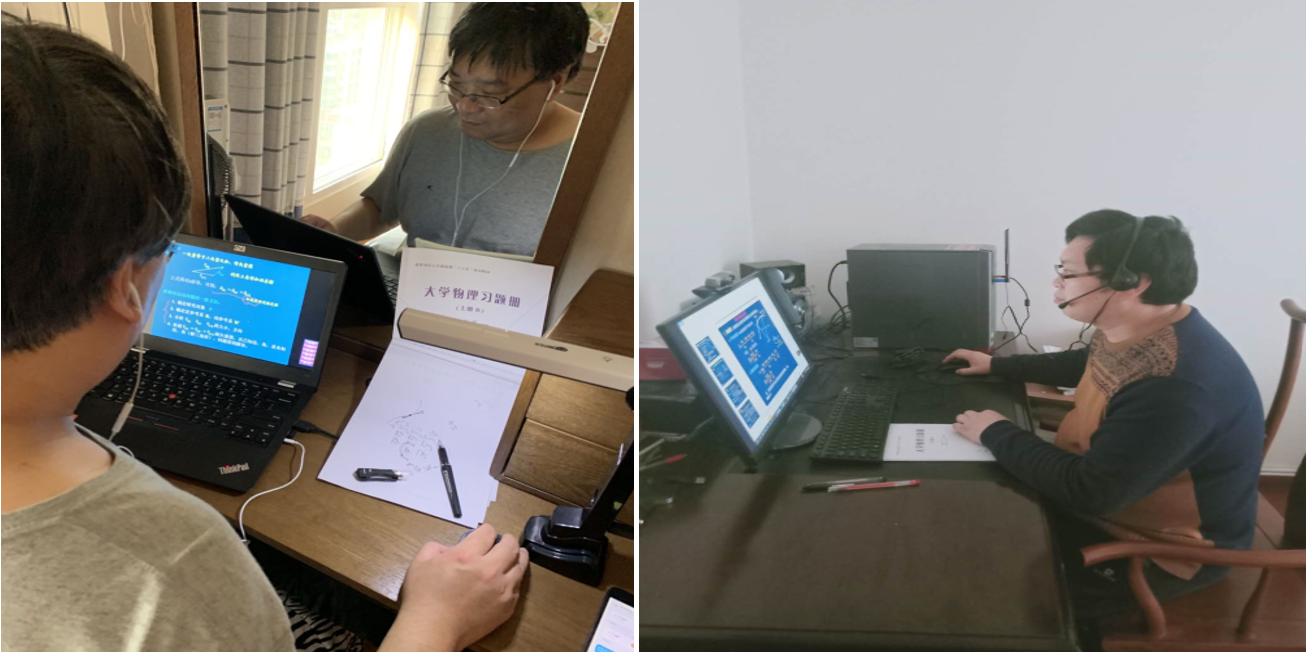 为了把大学物理“直播”课程上好,课程组每位老师都重新精心准备了线上教学的教案,揣摩线上教学问题,在试播阶段发现问题,解决问题,李存志老师在开课前反复研究线上课程上课的方式,害怕网络出现问题,准备了好几种备用方案。郭艳艳老师、崔继伟老师给重修班员工上课,时间在晚上,反复沟通、确认上课人数,确保不让一个员工掉队。王欣明老师为了达到平时教学中的板书和ppt结合效果,通过摄像头在纸上取景,并将摄像头取景画面和ppt放映画面通过屏幕共享功能同时直播。经过这样的处理,可以在讲授ppt的同时,实时书写进行板书演示,尽可能地达到和教室教学相同的效果。