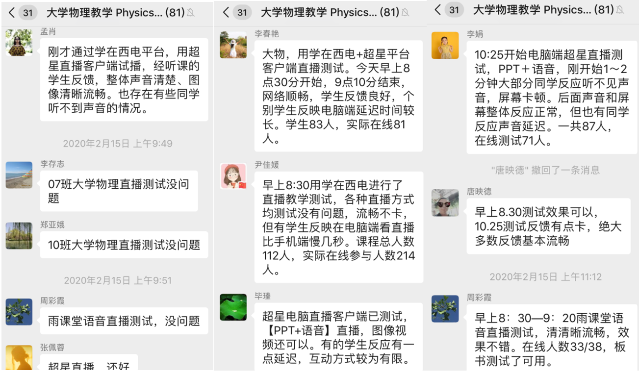由于大家都是初次面对直播教学,难免心里没底,课程组老师也是从“员工”做起,认真学习如何网上教学,有问题互相讨论,有心得互相分享。老师们每上完一节课都在教学群里反馈上课的情况,包括上课时间段、使用的在线平台,上课方式、网络情况、员工状态等等,非常详细,这些都是为了给其他老师借鉴,共同将每一节课做到完美。