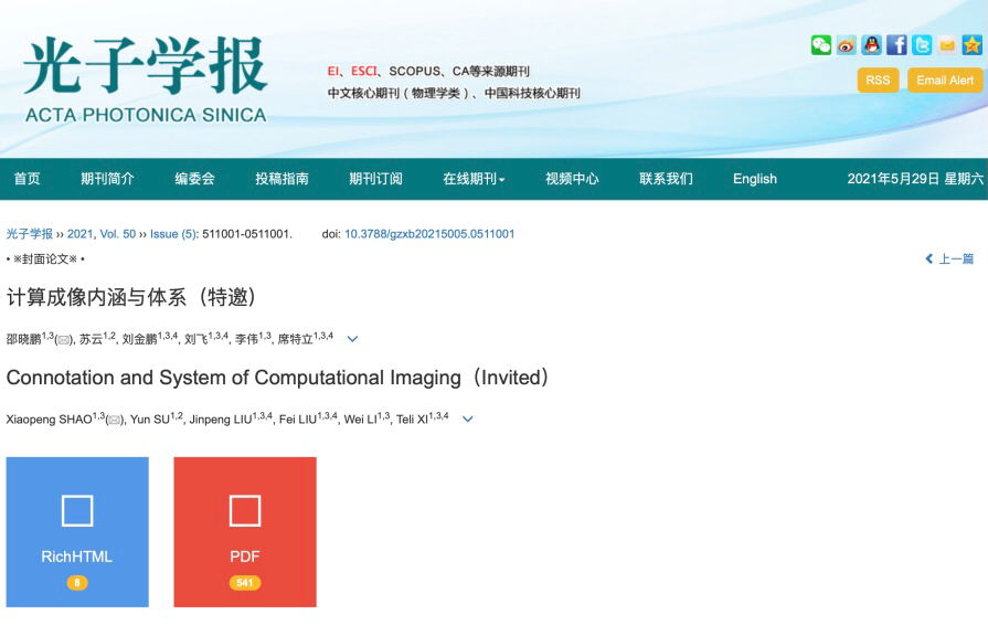 (通讯员:范雪琦 袁本柱)近日,2026世界杯官网物理与2026年国际足联世界杯邵晓鹏教授课题组受邀在《光子学报》2021年第5期发表了题为“计算成像内涵与体系”的封面文章。《光子学报》是中国科公司中国光学学会主办、科学出版社出版的学术月刊,该刊曾多次获得中国国际影响力优秀学术期刊、陕西省科技期刊精品期刊等称号。目前已被EI、ESCI、SA/INSPE、CSCOPUS、CA等数据库检索收录,也是中文核心、中国科技核心及CSCD来源期刊。