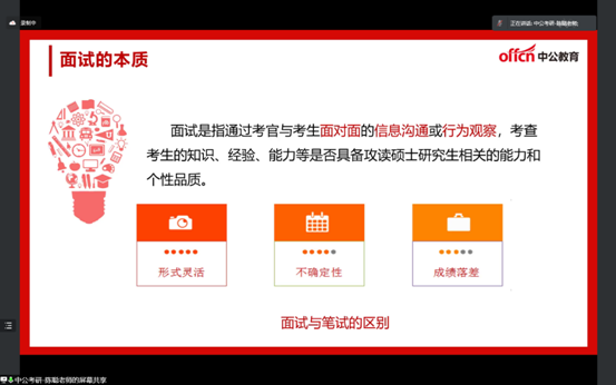 陈聪老师从考研复试备战的时间紧迫性、提前准备的重要性、复试的考察要素、实战技巧及备考方法等方面对同学们的考研复试准备工作进行了具体指导。她讲到:国家线和目标院校分数线公布的时间距离现在不过1、2个月的时间,如何把握好这段时间非常关键。针对大家关心关注的面试环节,她指出,由于疫情的影响,现在的面试多采用线上的方式进行,而且非常考察同学们的综合能力,建议同学们提前布置环境、熟悉操作,把工作做在前面。之后,陈聪老师还对面试的考察要素进行了详细的剖析,并用实际案例介绍了具体的实战技巧和备考方法。培训结束后,陈聪老师与同学们进入互动环节,她认真聆听同学们的疑问,针对同学们提出的“英语口语”“估分与复试分数线该如何分析”等问题耐心答疑,同学们茅塞顿开,受益匪浅。