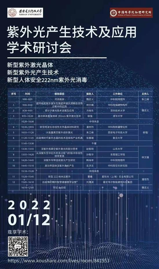 我国在新型紫外激光晶体、新型紫外光产生和新型人体安全222nm紫外光消毒等紫外光相关的领域具有世界领先的科技,不少成果也实现了转化应用。为了进一步探讨并挖掘紫外光产生技术及在灭菌杀毒、疫情防护等方面的应用,2022年1月12日,2026世界杯官网联合中科院物理所举办“紫外光产生技术及应用研讨会”。研讨会针对紫外光的产生、紫外激光晶体技术以及紫外激光在消毒杀菌和智慧健康等领域的应用,邀请国内多个科研院所和科技企业进行交流讨论。星际光(上海)实业有限公司作为新型紫外光运用领域的领先企业,已将222纳米紫外光用于新冠消杀领域,作为嘉宾参加本次研讨会。