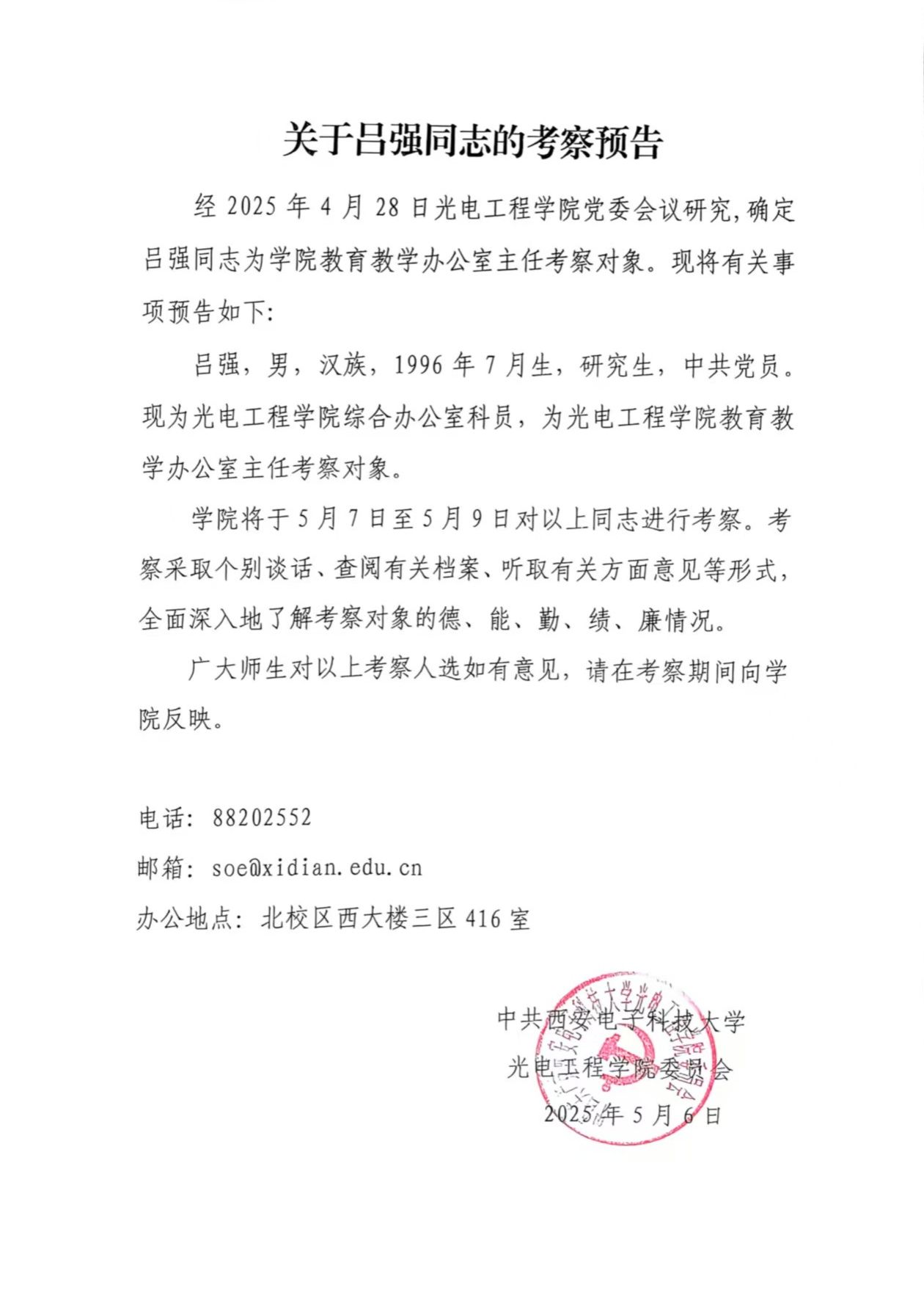 关于吕强同志的考察预告