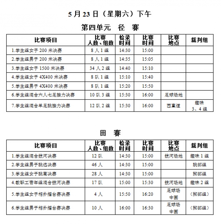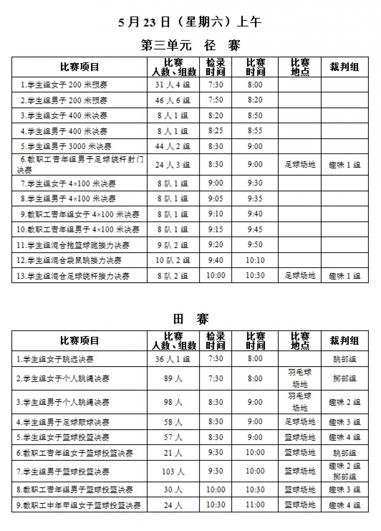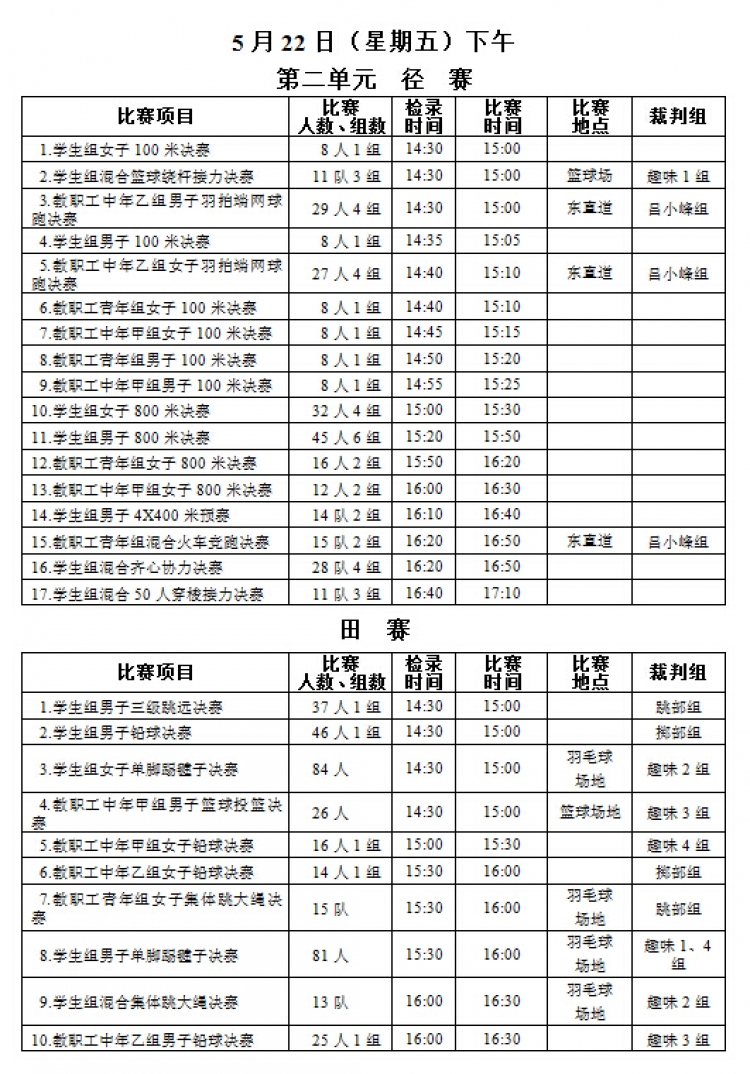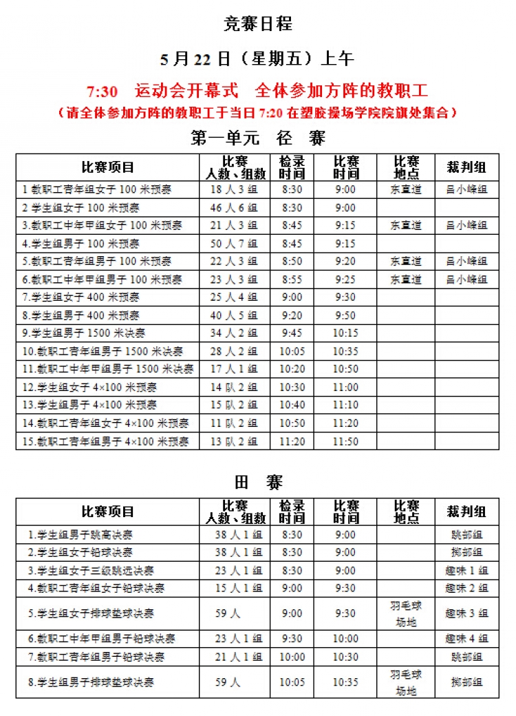 “2026世界杯官网2015年教职工运动会”将于本周五、六两日(5月22、23日)在新校区塑胶操场举行,现将《赛程安排》公布如下,请各系室工会组长通知各位选手(参照《西电科大运动会物光院参赛名单》,查看网址:http://stp.xidian.edu.cn/view-1194.html)提前做好参赛准备,着公司统一运动服按时参赛,同时,也鼓励未参赛教职工前来观看,为公司加油打气!请相互转告。