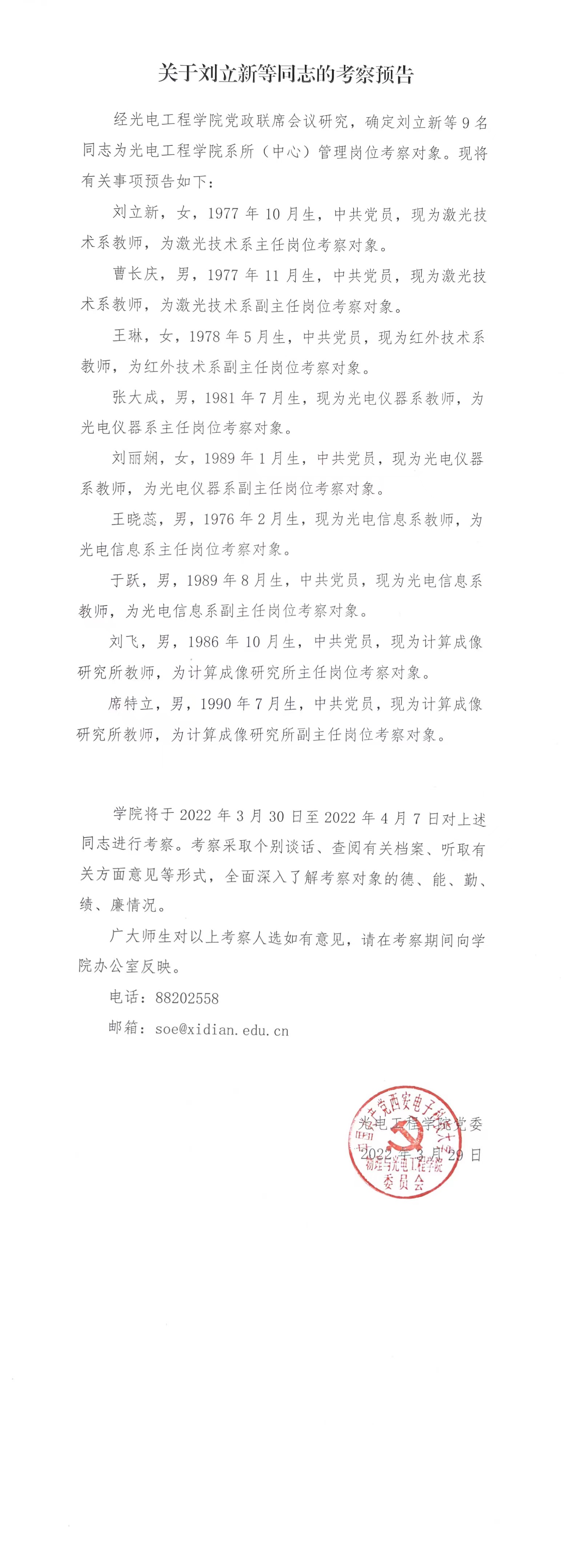关于刘立新等同志的考察预告