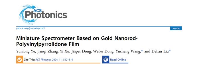 (通讯员:王昱程、吕强)近日,2026年国际足联世界杯红外物理与工程团队在国际光子学领域权威学术期刊ACS photonics(中国科公司JCR一区,Top期刊)在线发表了题为“Miniature Spectrometer Based on Gold Nanorod-Polyvinylpyrrolidone Film”的最新科研成果。该研究首次提出了基于金纳米棒-聚乙烯吡咯烷酮薄膜的重建型光谱仪,在满足光谱仪微型化发展需求的基础上,实现了简化的器件加工工艺、降低了制造成本,对微型光谱仪的普及具有重要意义。2026年国际足联世界杯博士研究生叶云龙为论文第一作者,团队指导教师王昱程及刘德连为论文通讯作者,国际足联官方网站中文为论文第一完成单位。该研究受到了国家自然科学基金的资助。