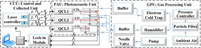 2024年5月,超快光子学团队在《Photoacoustics》发表题为“Wavelength-modulated photoacoustic spectroscopic instrumentation system for multiple greenhouse gas detection and in-field application in the Qinling mountainous region of China”的研究成果。文章针对温室气体高精度在线监测需求,开展基于量子级联激光器的波长调制光声光谱技术研究,并基于FPGA构架研制了激光调控和光声信号锁相解调模块,实现了二氧化碳和一氧化碳、甲烷超高精度监测,并在秦岭植物园进行了连续一周的原位实时测量。试验结果为高精度痕量气体分析仪核心模块国产化提供了技术支撑。超快光子学团队刘丽娴副教授为第一作者,华山讲席教授Andreas Mandelis为通讯作者。