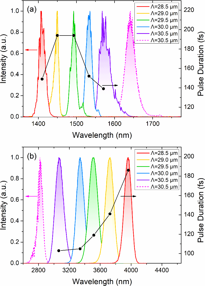 图3 (a)信号光和(b)闲频光的光谱调谐情况及对应的脉冲宽度