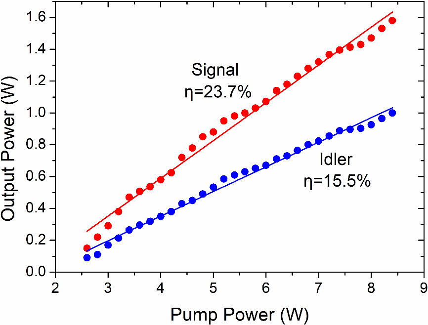 图2 信号光和闲频光的输出功率随泵浦功率的变化