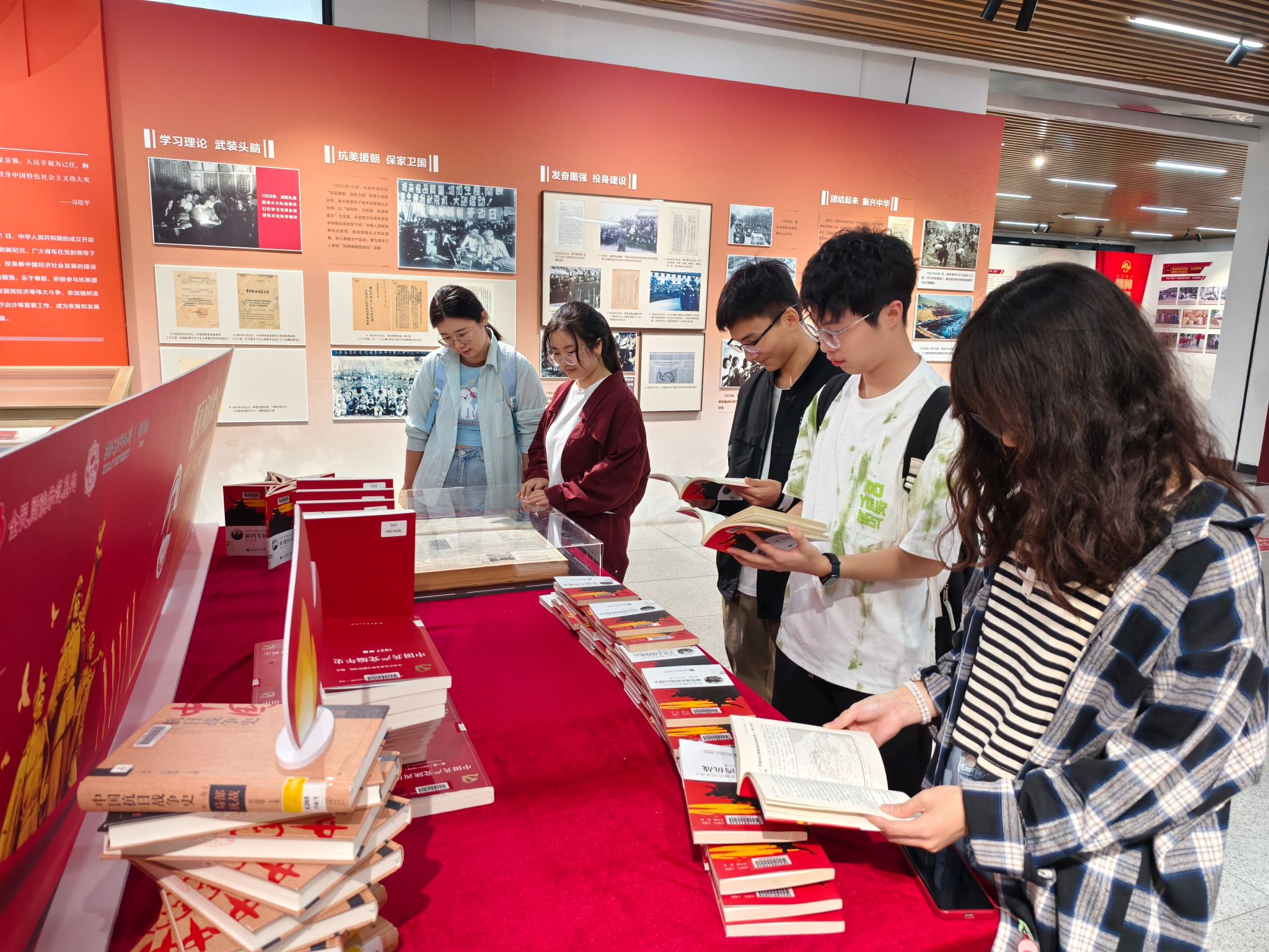 最后,同学们来到南校区图书馆一楼文化长廊参观“纪念中国人民抗日战争暨世界反法西斯战争胜利80周年”专题展览,依次参观了“科学的千里眼顺风耳”历史图片展、“弘扬延安精神、抗战精神,担当强国复兴使命”主题书画作品展和“纸页间的烽火”专题书展,在展览中回望峥嵘岁月,感悟崇高精神,砥砺强国信念,凝聚奋进力量。