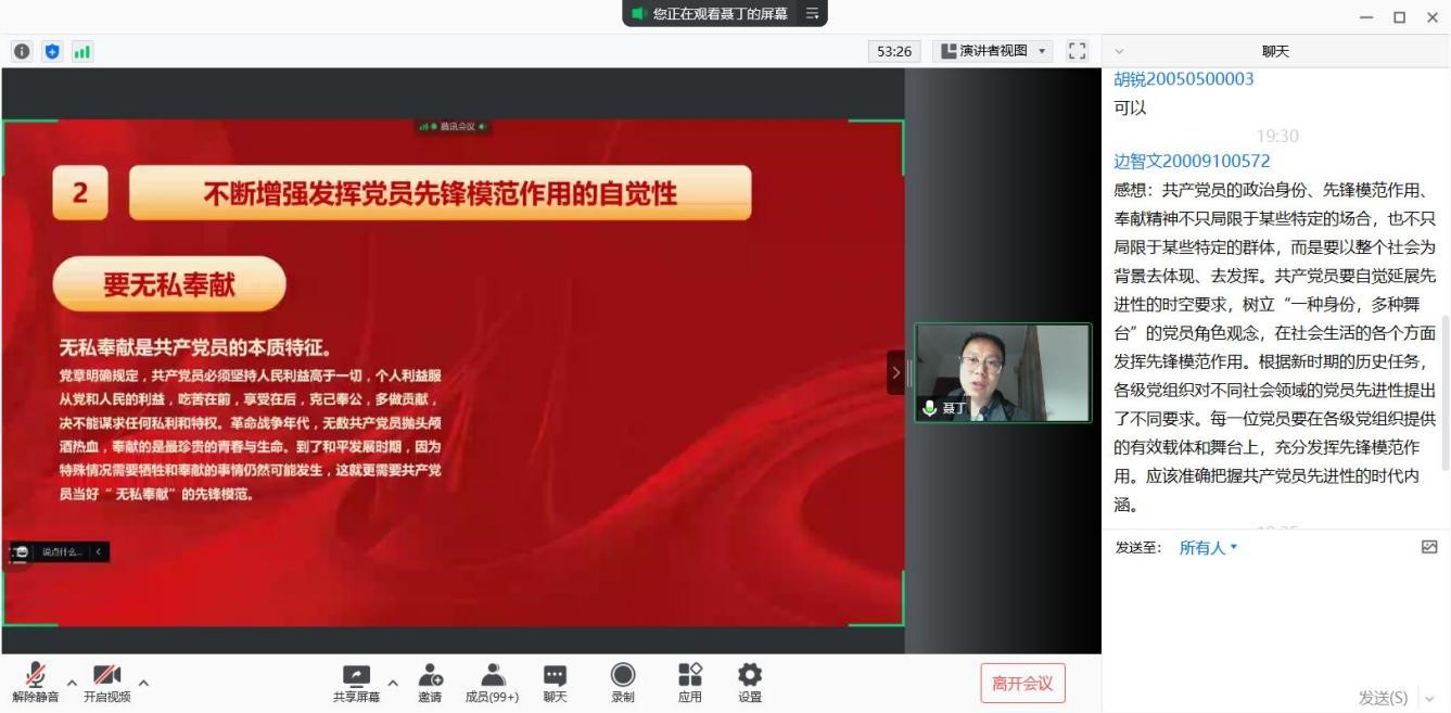 2005019支部候塞金提到,聂丁老师先通过孙家栋、杜富国等人的事迹说明了先锋模范作用的极端重要性,深深地感召了我,党员是中国人民的先锋队,无论在什么时刻,党员应该永远站在第一线。“中国共产党”不仅仅是一个身份,更是“能打胜仗,作风优良”的行动,一份“广大人民群众利益为先”的责任,一种“共产党员冲在前”的精神。听完聂老师的党课报告,我今后一定发奋学习,只争朝夕,当好先锋,争取早日成为党旗下的共产党员!