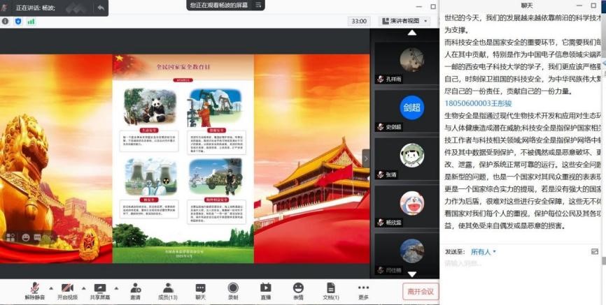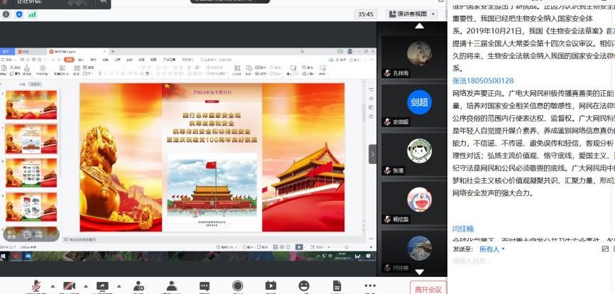 支部党员同志纷纷表示,通过这次的线上“党员先锋论坛”,不仅了解了全民安全教育日相关法律知识,也增加了自身的安全意识。我们要在学好科学知识的基础上,有意识的训练自己的各项技能,为将来建设祖国、保卫祖国奠定良好的基础。今天的我们注定是大有作为的一代人,也注定要成为担当民族复兴大任的时代新人,我们要成为国家安全知识的积极传播者、爱国主义的坚定践行者、国家安全的忠实守护者,为维护国家安全贡献智慧和力量!