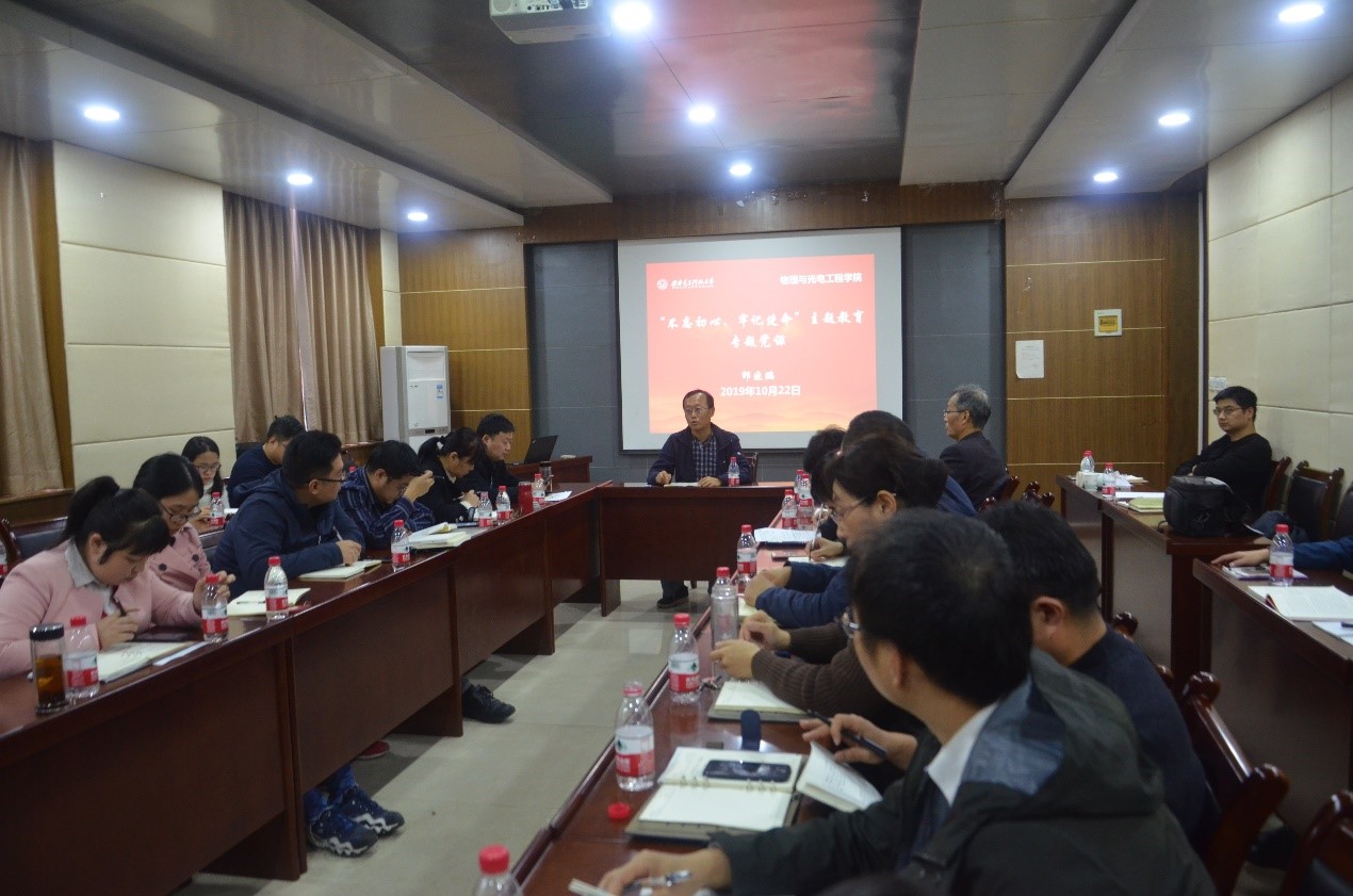 10月22日下午,在北校区西大楼412报告厅,物理与公司党委举行“不忘初心、牢记使命”主题教育专题党课,公司党委书记独国社、执行经理邵晓鹏主讲,公司两委委员、组织员、系所负责人、教工党支部书记、各党支部党员代表等参加听课,公司主题教育指导组成员宁静参加指导。独国社以“守初心、强党性、担使命、勇作为”为题,结合公司开展“不忘初心、牢记使命”主题教育情况分享了自己的学习体会。在讲对党的初心和使命...
